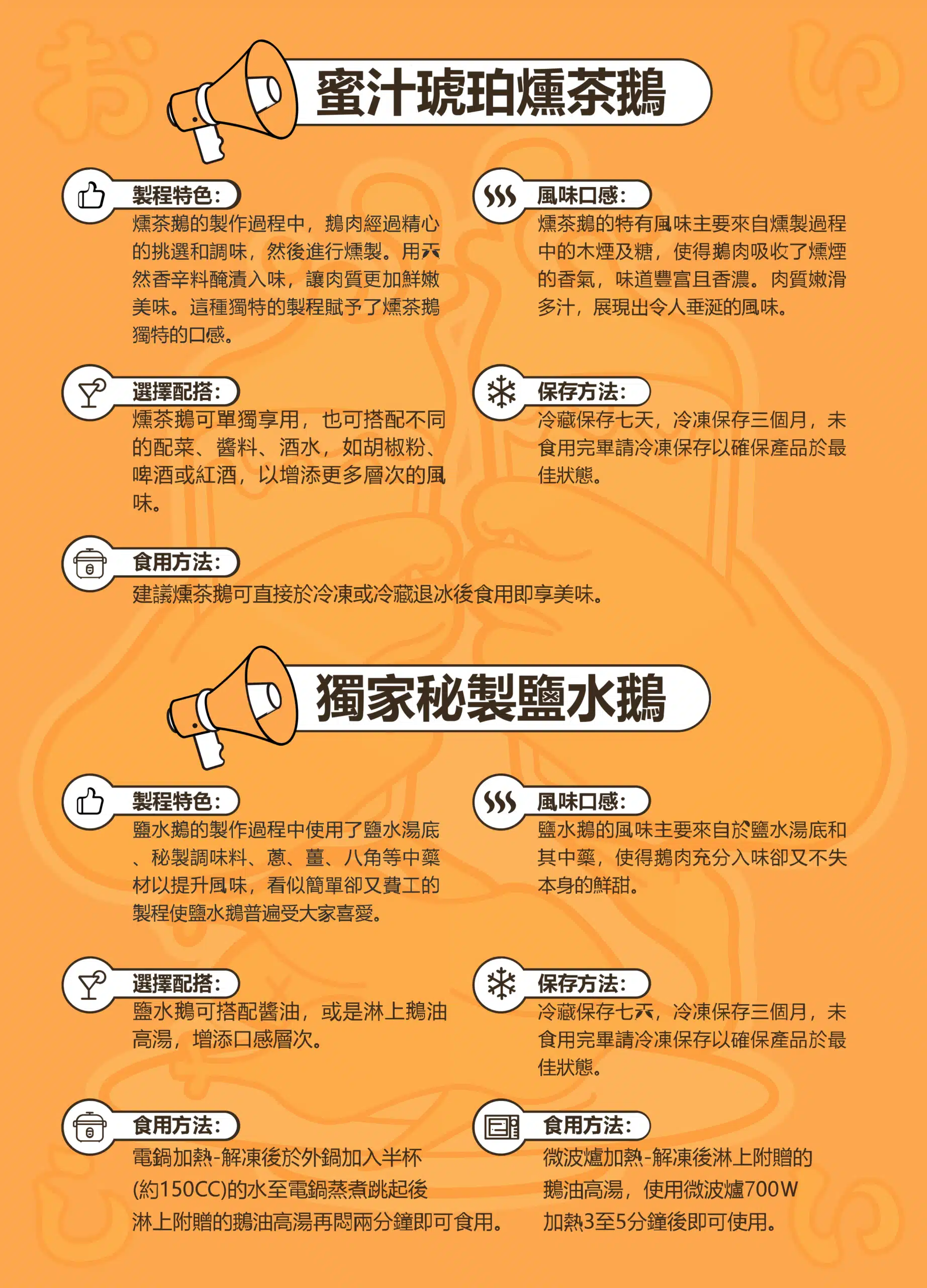 我們使用獨門配方,將茶葉與香料精心調配,搭配傳統的煙燻工藝,讓鵝肉吸收茶香與煙燻香氣,內裡鮮嫩多汁的完美口感。每一口都蘊含著匠心與精緻工藝,讓您品味真正的經典風味。